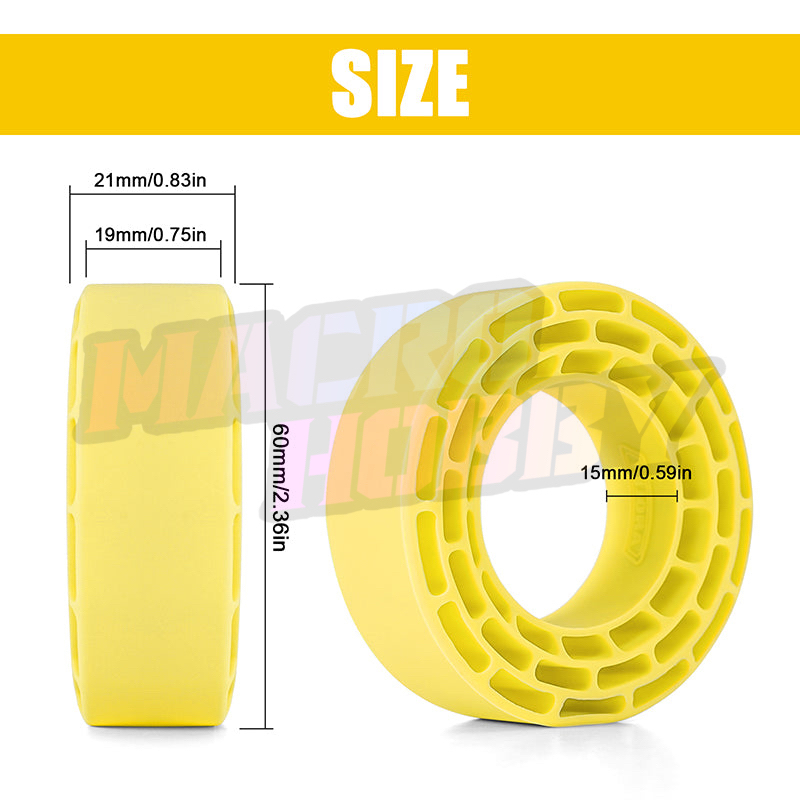 INJORA 4pcs Silicone Rubber Inserts for 1.3" Tires (68-72mm) Fit Tire Outer Diameter: 68mm-72mm Fit Tire Width: about 26-27mm Compatible with these INJORA tires: 70*27mm Swamp Claw YQT-1319 70*26mm Cling On YQT-1320 72*24mm XHX Pin YQT-1321 (Note: Using these inserts with 72mm tires may create a beneficial air gap, allowing for additional compression and enhanced 'squish' on various terrains.) Features: Made of Silicone Rubber materials Waterproof and temperature resistant More superb sidewall support than regular foam to keep the shape of tires Specifications: Material: Silicone Rubber Size: 60*21mm (2.36*0.83in) Weight: 17g/pcs Yellow Inserts: Super Soft Green Inserts: Soft Package List: 4 * Silicone Rubber Inserts